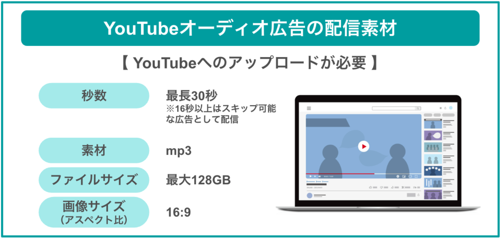 YouTubeオーディオ広告(音声広告)は音声だけでなく、動画や画像の素材も見られることもあるため、適切な素材を制作することが重要です。キャンペーンの内容やイメージが伝わるようなシンプルかつ魅力的な素材を作成し、設定することが重要です。