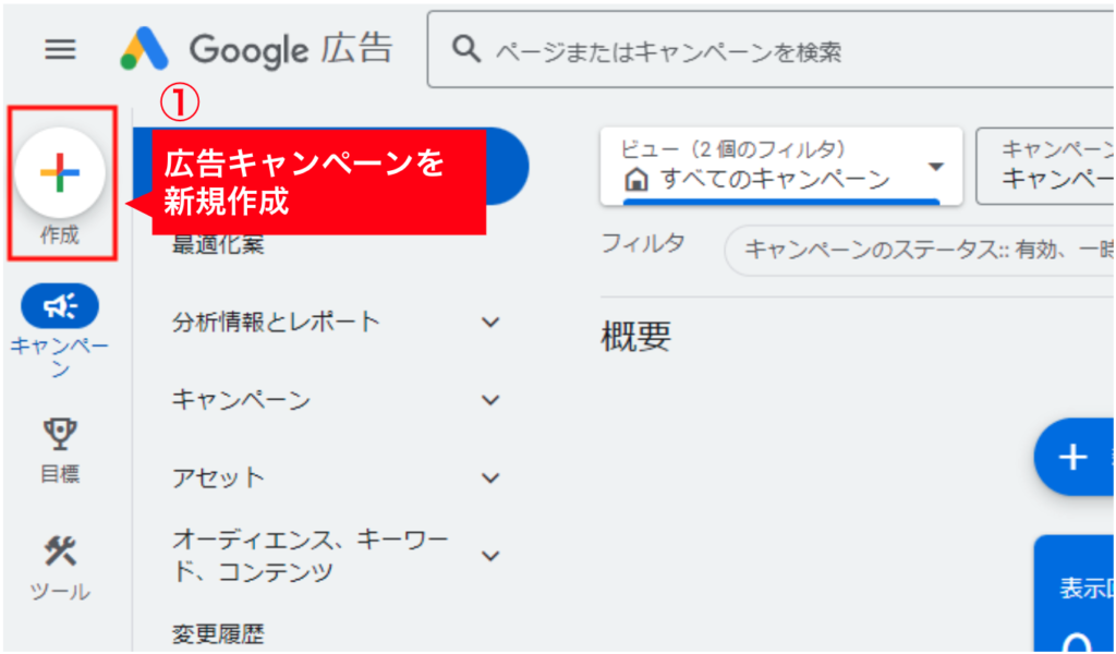 ログイン後、Google Adsのダッシュボードから「作成」をクリックし、ポップアップの「キャンペーン」という項目を選択します。