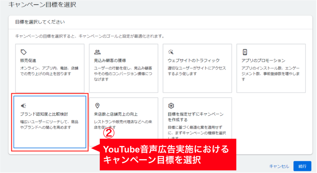 広告キャンペーンの目標を選択します。オーディオ広告の場合、「ブランド認知度と比較検討」を選ぶことが多いです。