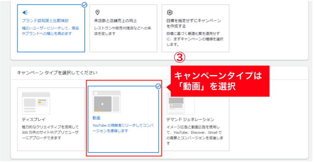 キャンペーンタイプは、ここでは「動画」を選択します。これはYouTube上で配信される広告を設定するための選択です。