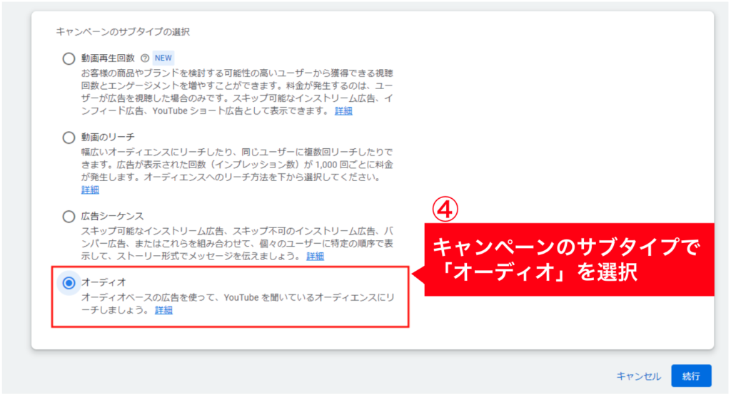 キャンペーンのサブタイプは「オーディオ広告」を選択します。これにより、オーディオに特化した広告の設定となります。