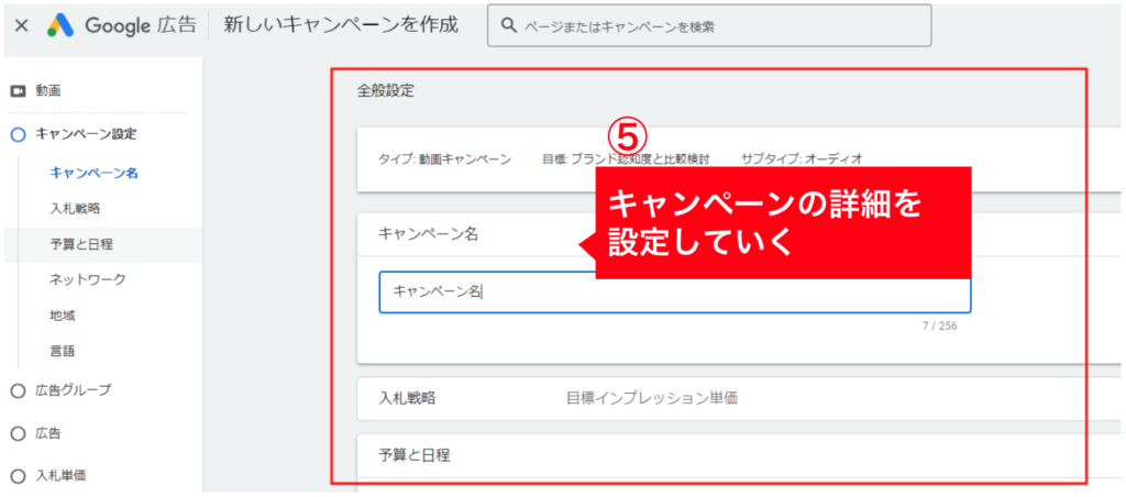 キャンペーン名、予算、広告スケジュール、ターゲティングオプション(地域、言語、デバイス、オーディエンスなど)を設定します。
