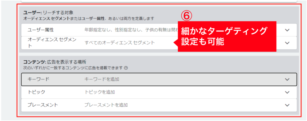 オーディエンスのターゲティング設定を行います。ターゲットとする視聴者層(年齢、性別、興味など)を詳細に設定します。
