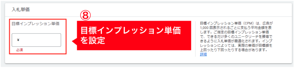 最後に入札単価の設定を行います。広告の1000回表示に対していくら払うかの目標数値を記入します。この値の相場は10~500円程度と幅広いのでキャンペーンや予算に合わせて設定する必要があります。入札単価の設定まで終われば広告は設定は終了です。広告が実際に出稿されたら、正しく広告が機能しているか確認しましょう。
