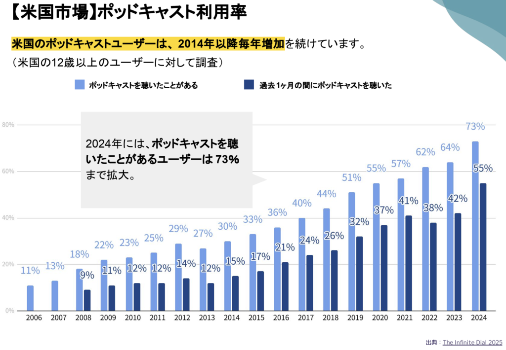 ポッドキャストは、その配信の仕組みやアクセスのしやすさによって、2024年時点で米国においてポッドキャストを聴いたことがあるユーザーは73%まで拡大しています。