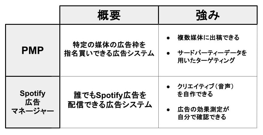 PMPは特定媒体の広告枠を買い付けできるシステムに対して、Spotify広告マネージャーは誰でもSpotifyを配信できるシステムのことです。PMPの特徴は、複数媒体に広告出稿ができることです。一方、Spotify広告マネージャーの特徴は、広告クリエイティブを自身で制作できることです。