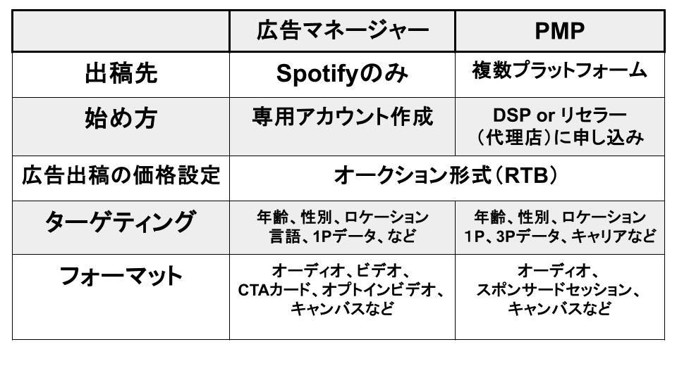 広告の出稿先においては、広告マネージャーはSpotifyのみに対し、PMPはSpotifyを含めた複数プラットフォームに出稿できるという特徴があります。