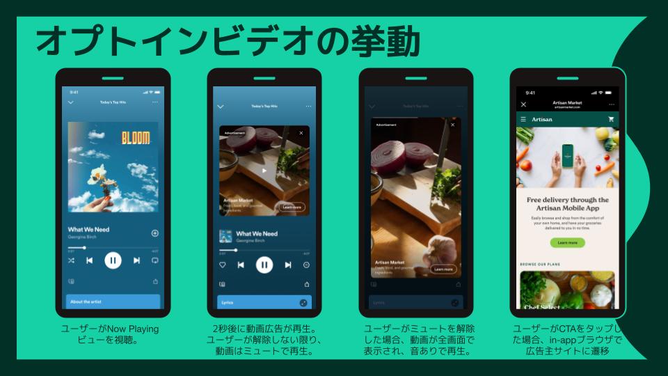 「オプトインビデオ」は、モバイルでの楽曲再生中(Now Playing)に無音の動画広告が再生される広告フォーマットです。ユーザーは広告をタップしてミュートを解除することができ、広告内にあるCTAボタンをタップすると、ブラウザで広告主のサイトに遷移します。