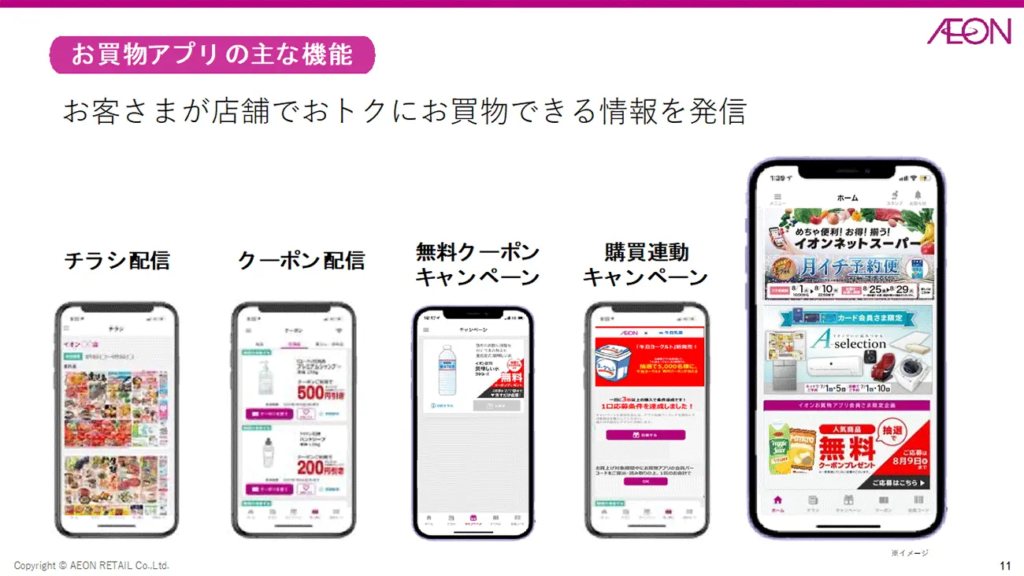 イオンリテールは、公式アプリ「イオンお買物アプリ」をリテールメディアの核として位置付けています。このアプリ内で、メーカーはクーポンやキャンペーンを広告枠として出稿することが可能です。