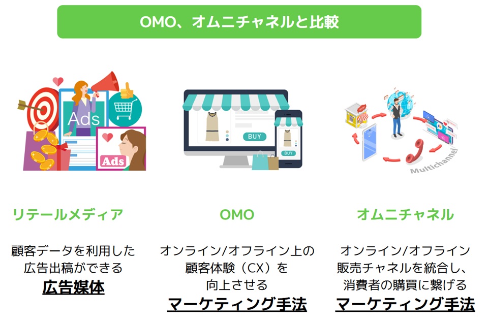| 定義 | 小売店が媒体社となって提供している、顧客データを利用した広告出稿ができる広告媒体 | オンライン/オフラインを融合させ、顧客体験(CX)を向上させる、マーケティング手法 | オンライン/オフライン販売チャネルを統合し、消費者の購買に繋げる、マーケティング手法 |