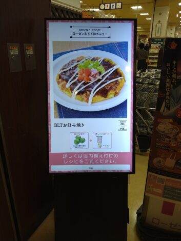 画像のように、店舗のおすすめのメニューを表示させることで、「おいしそう」「買ってみよう」と感じてもらいやすくなります。また、時間帯や曜日に応じて配信内容を簡単に変更でき、週末は家族向け、平日はサラリーマン向けなど、ターゲットに合わせた広告配信が可能です。さらに、デジタル広告と連携すれば、SNSやECサイトで見た商品を店頭で思い出し、購買意欲を高める効果も期待できます