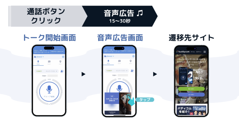 buddycomの音声広告は、無料プランを利用するユーザーに配信されます。ユーザーの利用頻度に応じて音声広告が配信されており、15秒〜30秒の音声広告が配信可能です。音声広告が再生されると同時に掲載されるコンパニオンバナーも表示されます。コンパニオンバナーをクリックすることで指定リンク先に遷移が可能です。