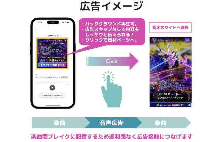 広告例としては、番組内で、15秒〜30秒の音声広告が配信可能です。音声広告が再生されるとコンパニオンバナーも表示されます。コンパニオンバナーをクリックすることで指定リンク先に遷移が可能です。