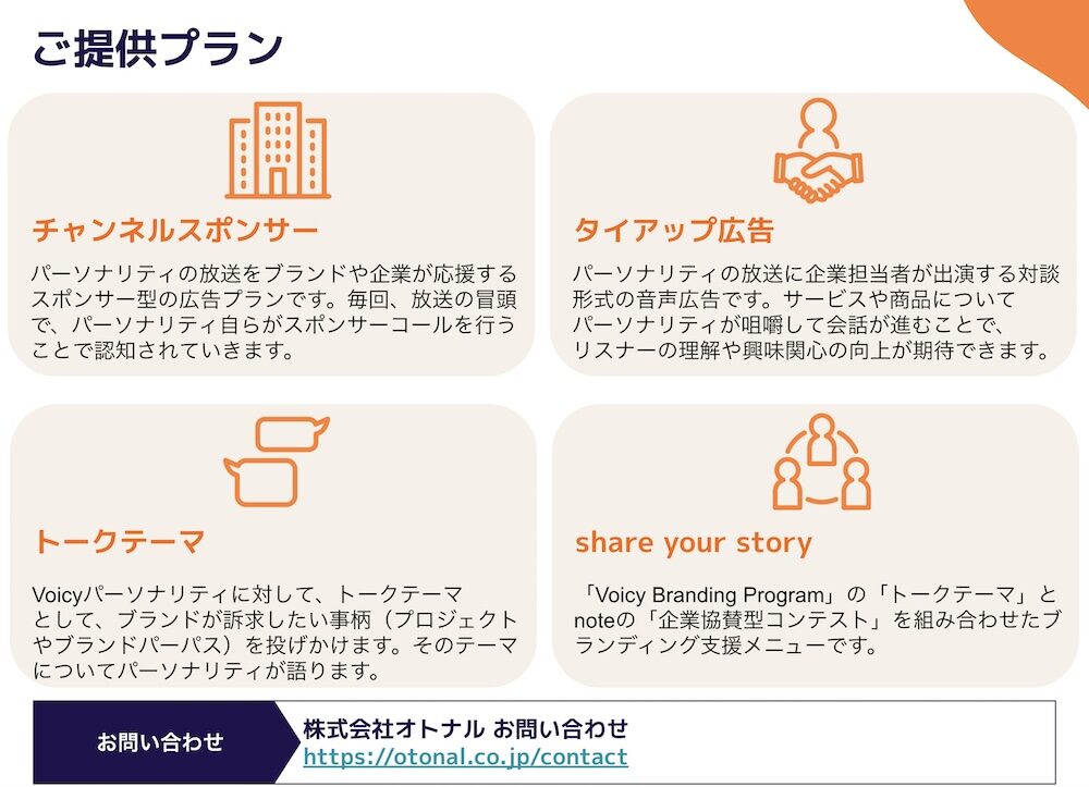 Voicyの音声広告『Voicy Branding Program』には、「チャンネルスポンサー」「タイアップ」「トークテーマ」「share your story」の主に4つの音声広告プランがあります。広告主のニーズに合わせた広告出稿が可能です。