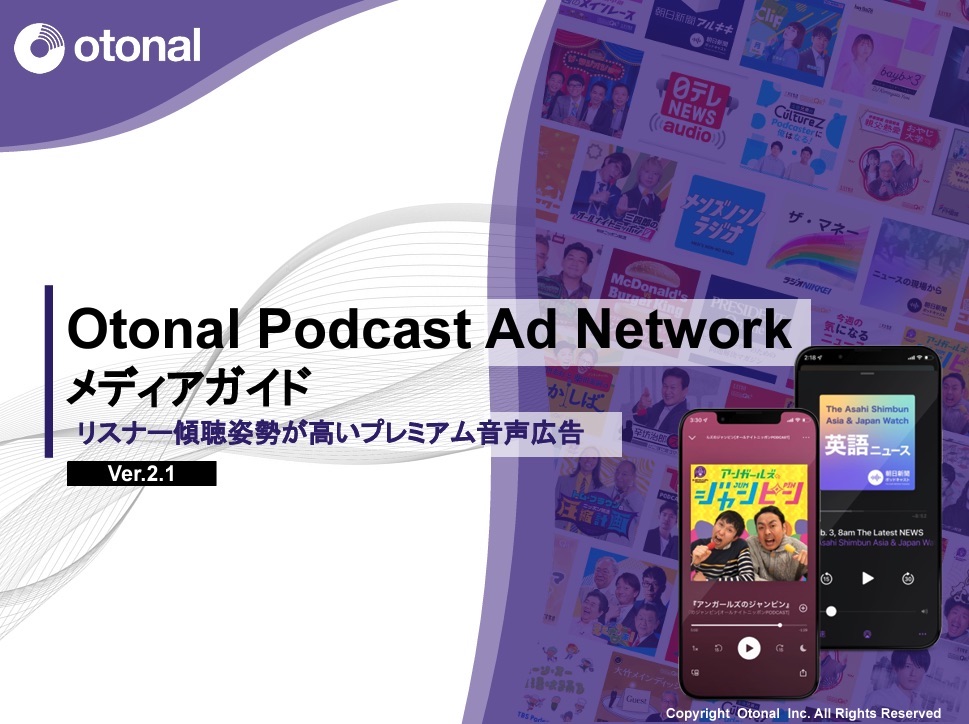 『オトナルポッドキャストアドネットワーク』は、月間1億以上の広告配信を実現できる国内最大のポッドキャストのアドネットワークとなっています。
