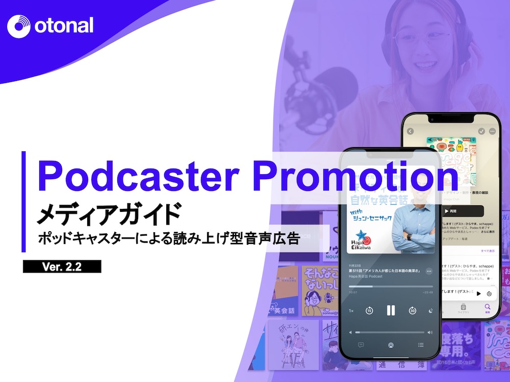 オトナルでは、ホストリード広告への配信が可能な『ポッドキャスタープロモーション』について、専用ページにて音源事例や出稿可能な番組など詳しく解説しています。人気ポッドキャスターが、商品紹介を独自に行い、リスナーや消費者に愛されるブランドへの信頼や共感を生むプロモーションを実現します。