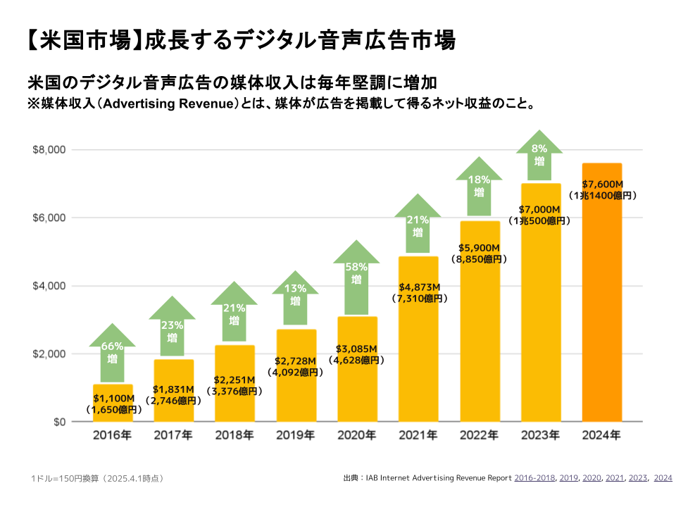 米国デジタル広告の業界団体であるIABによると、米国のデジタルオーディオ広告の市場成長は加速しており、2024年には約76億ドル(日本円で1兆1,400億円※2025年5月19日現在)の規模となっています。
