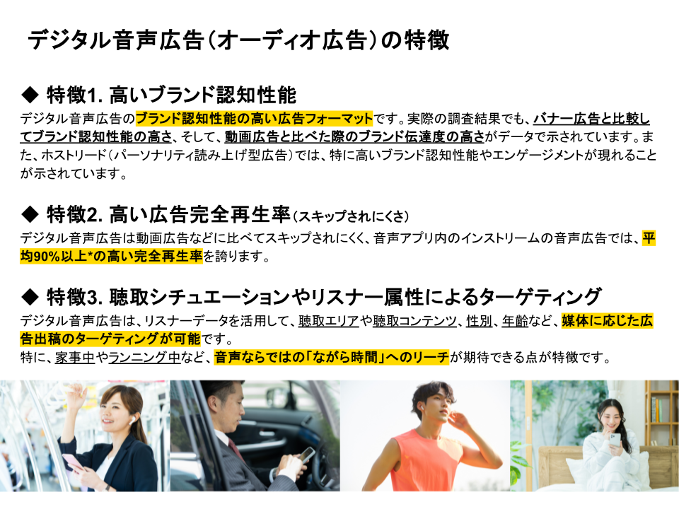 課金形態はクリック課金ではなく、特定の広告を実際に“聞いた”ユーザー数(インプレッション)に基づいて費用が発生するのが一般的で、ラジオ広告とは異なり、セグメントを絞った広告配信ができる点が大きな特長です。