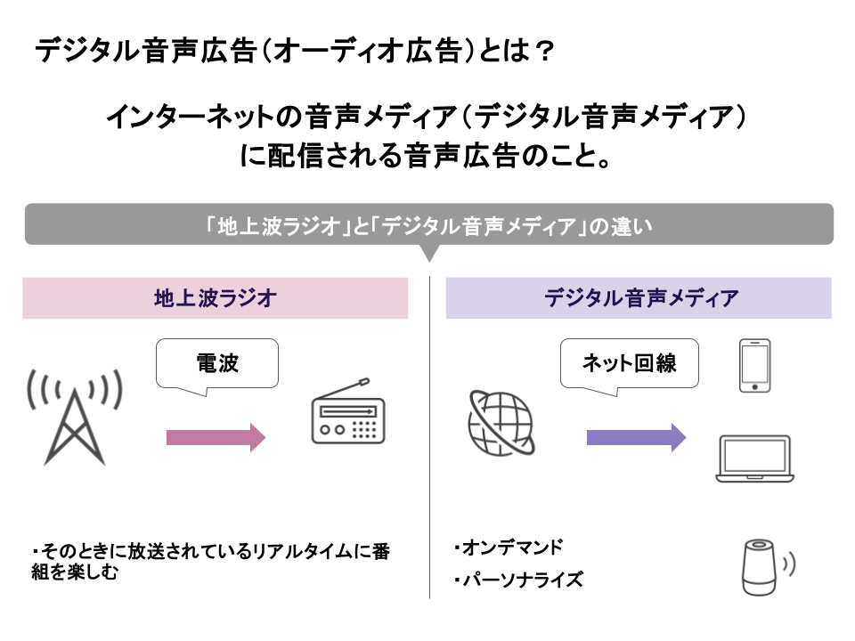 デジタルオーディオ広告(音声広告)とは、音楽配信サービスや音声アプリ、ポッドキャストなどの“インターネットの音声メディア”の中で配信される広告フォーマットのことです。