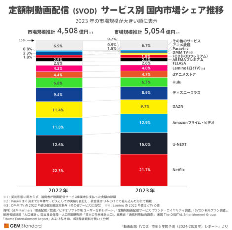 日本国内で、Netflixは21.7%と高いシェアを獲得しており、抜群の存在感を示しています。