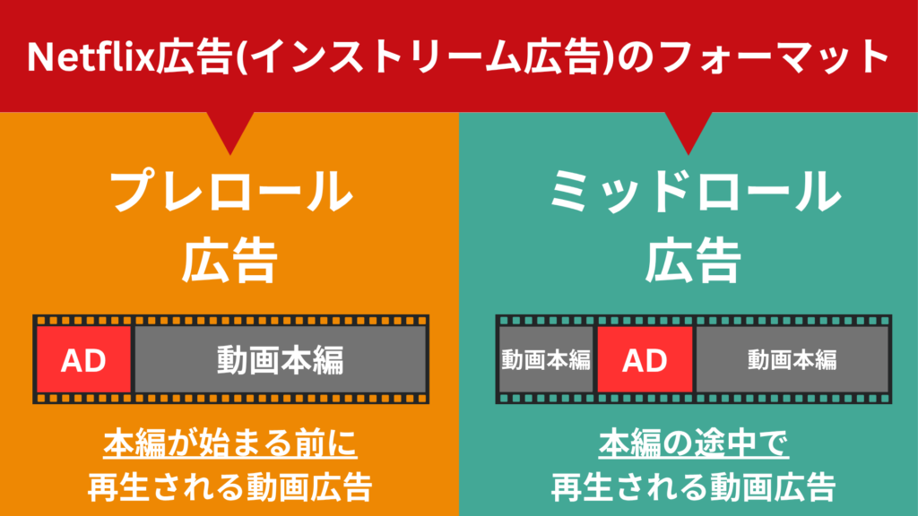 Netflix広告の主要な2つのフォーマット、プレロール広告とミッドロール広告について、詳しく見ていきましょう。