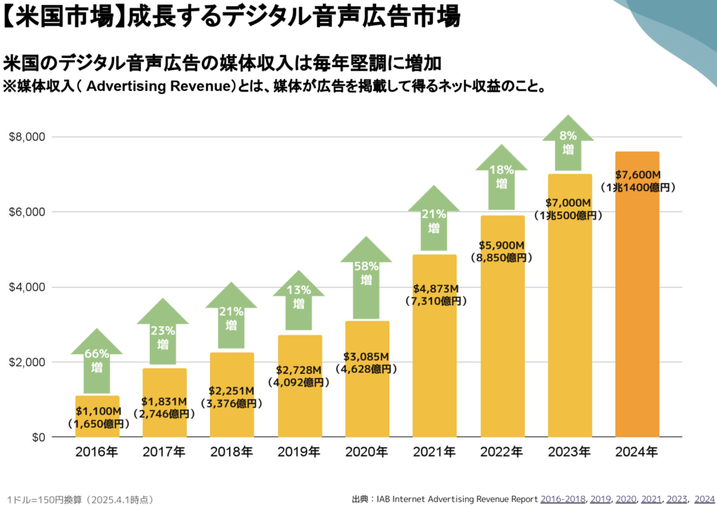 これらの情報から、音声メディアは世界的に広がっていて、尚且つ飛躍的な成長を遂げていることがわかります。
