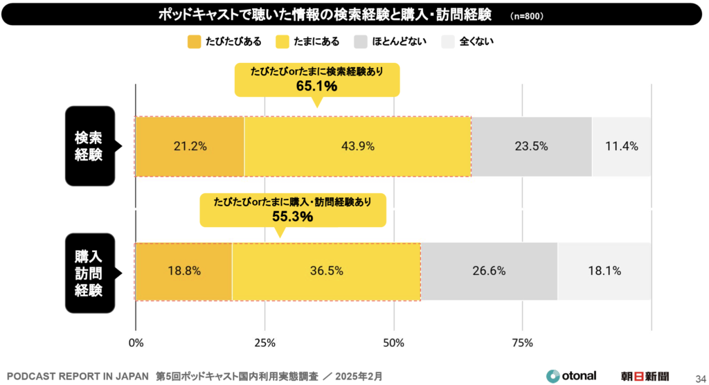 オトナルと朝日新聞社で共同実施したポッドキャストの利用実態調査『第5回ポッドキャスト国内利用実態調査(2025.2月)』では、ポッドキャストで紹介された商品や場所、エピソードについて、6割以上のユーザーが一定頻度で検索を行い、また4割以上のユーザーが商品を購入したり、場所に行ったことがあると回答しています。