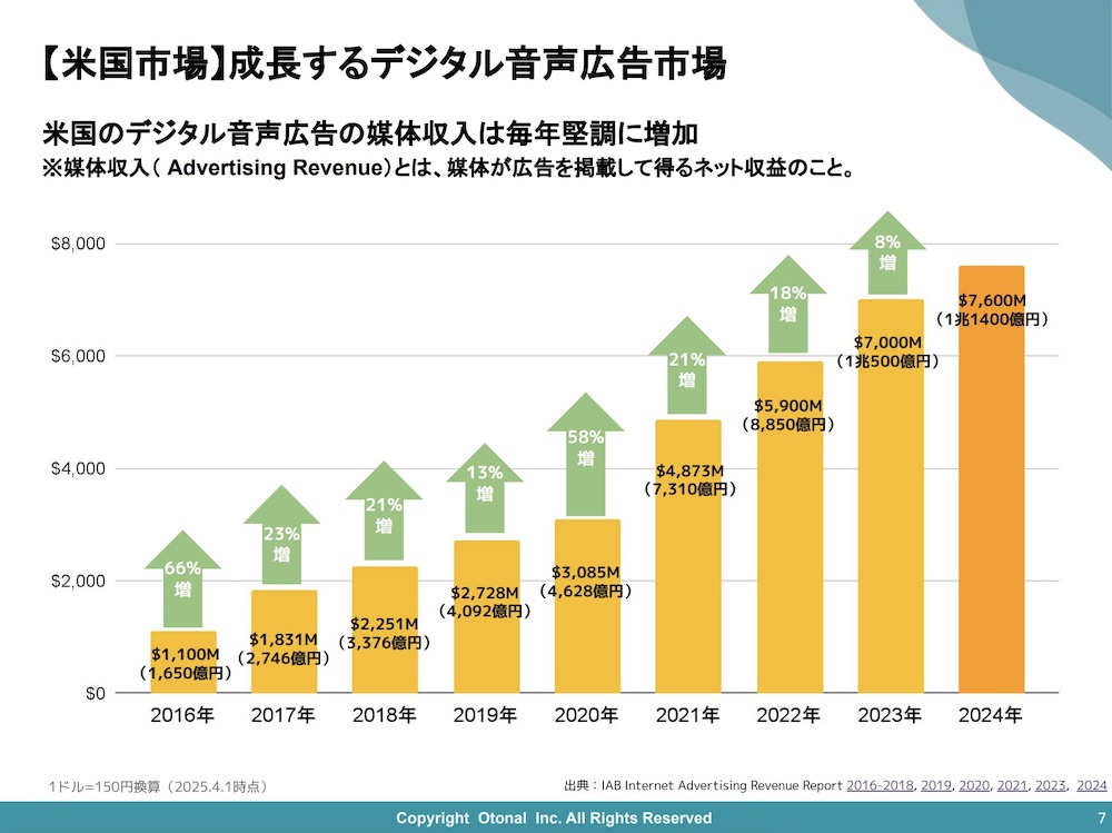 米国では2023年にデジタル音声広告の媒体収益が前年比18%増の約1兆円(※1ドル=150円換算)、2024年には1兆1,400億円超へと拡大。日本国内でもデジタル音声広告の配信や企業によるブランデッドポッド配信の増加など、マーケティング活用が加速しています。