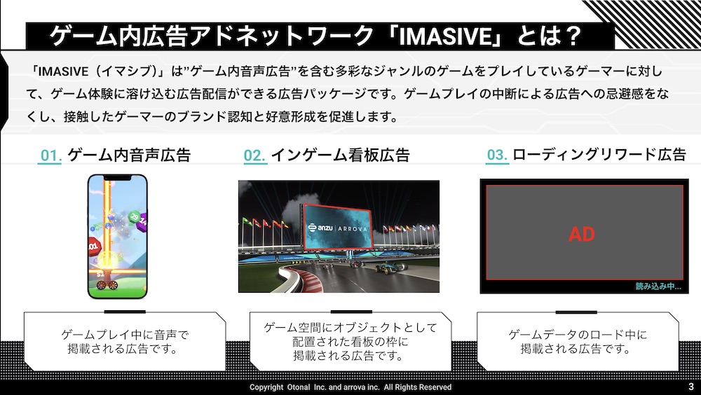 「IMASIVE(イマシブ)」は、オンラインゲーム向けの没入型ゲーム内広告アドネットワークです。
