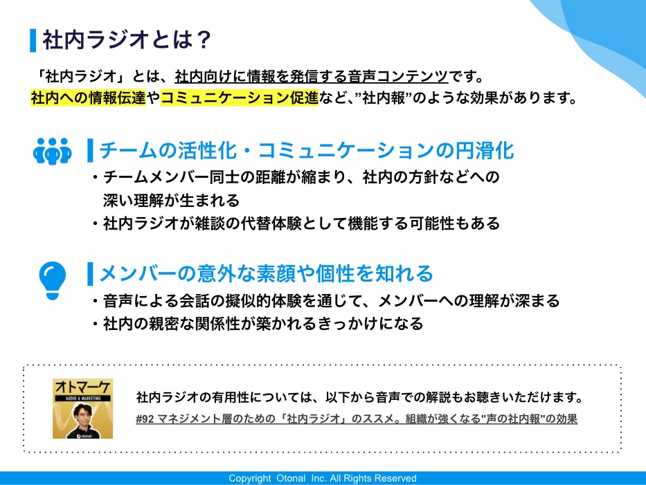 さらにオトナルでは、企業のポッドキャスト番組制作サービスも提供しています。番組企画から収録、編集までの一貫したサポートにより、ハイクオリティな社内ラジオを手間なく実現、聴取満足度の向上や継続的な運用をサポートします。