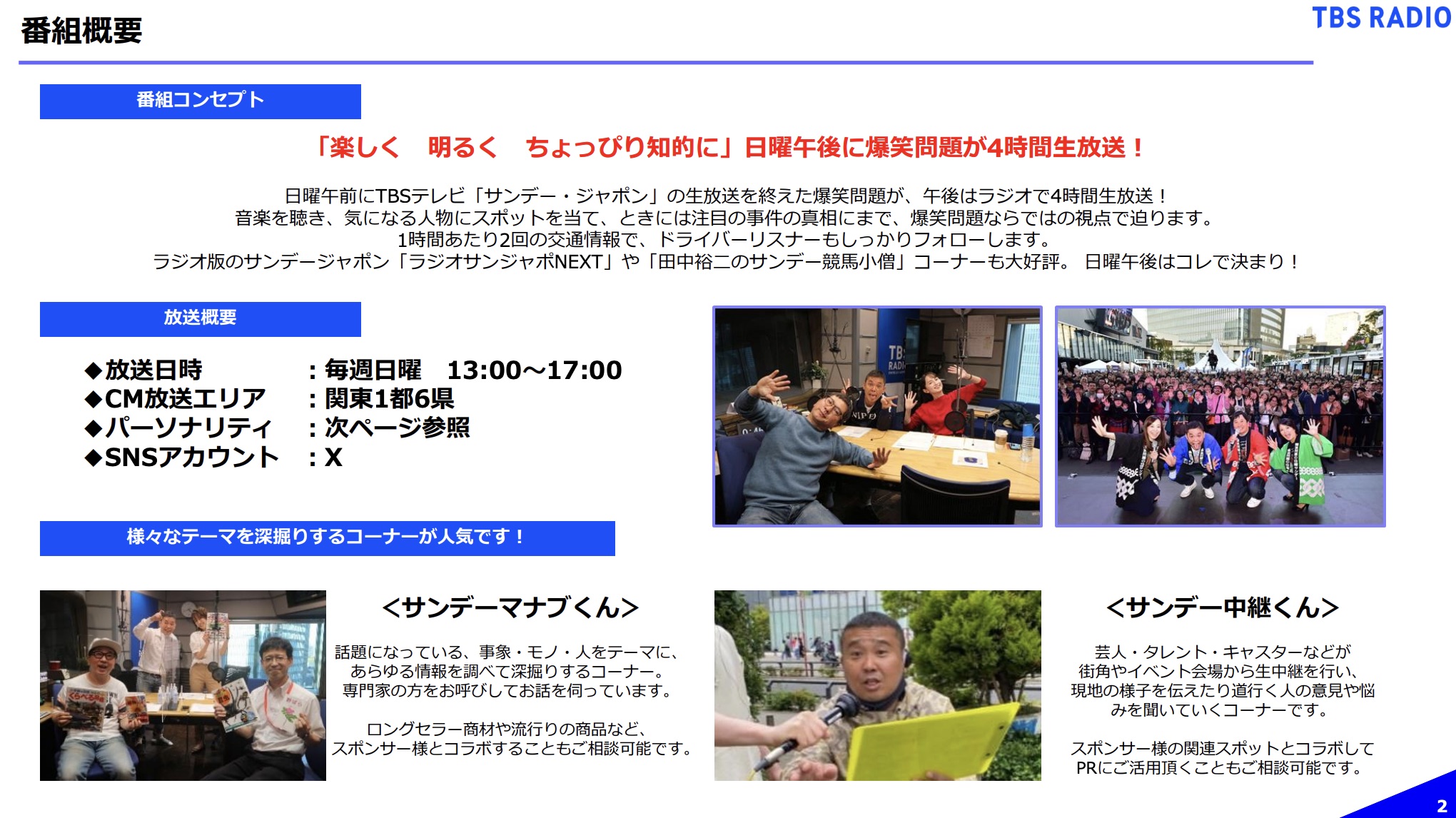 『爆笑問題の日曜サンデー』が提供している広告枠概要です。コーナーへの提供やタイアップ企画など、過去事例を含めて詳細資料にて紹介しています。