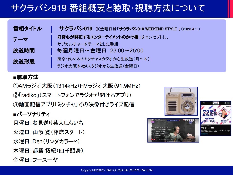 ラジオ大阪の番組『サクラバシ919』が提供している広告枠概要です。番組概要や聴取データをはじめ、曜日別パーソナリティの紹介など、詳細資料にて紹介しています。