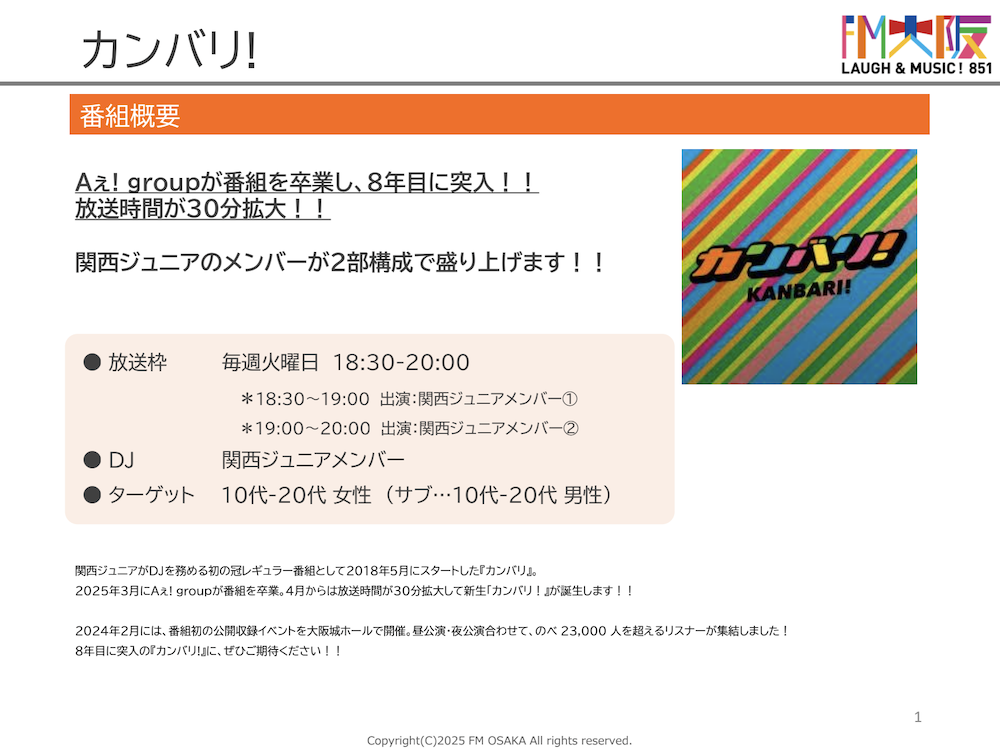 毎週火曜日 18:30-20:00 放送の番組『カンバリ!』の広告枠概要資料です。