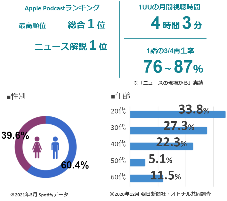 朝日新聞ポッドキャストは、1ユーザあたり月平均4時間以上聴かれるほどのエンゲージメントを獲得しています。 リスナー属性としては6割が20~30代で、約8割が大都市圏で聴かれています。
