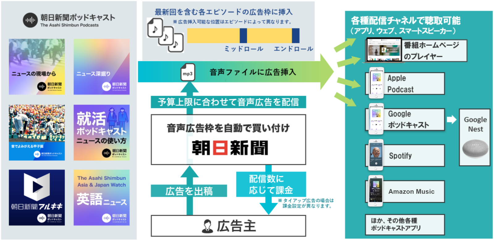 朝日新聞社の音声報道番組のブランドである「朝日新聞ポッドキャスト」各番組に広告を挿入できる広告配信サービスです。