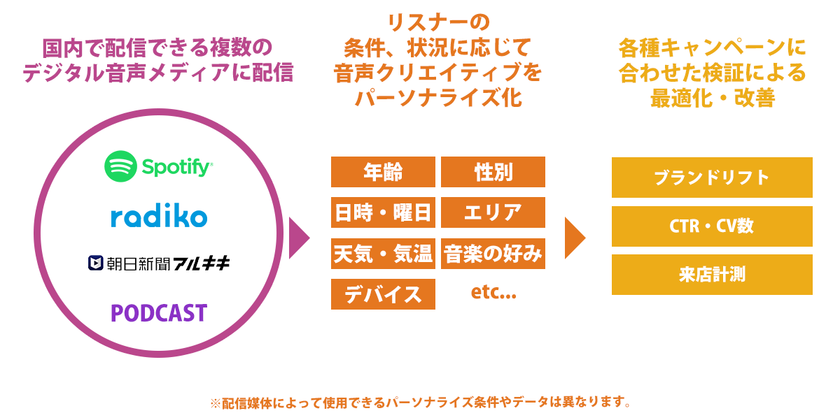 音声広告クリエイティブをリスナーデータやシチュエーションに合わせてリアルタイムに作成することで、広告主からのメッセージを音声メディアのリスナーひとりひとりにパーソナライズ化して語りかけるように、広告メッセージを伝えることができます。