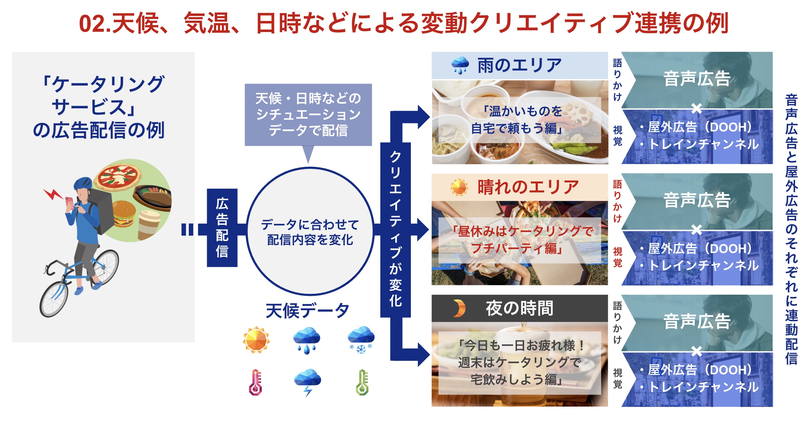 デジタル屋外広告(DOOH広告)とデジタル音声広告では、それぞれの広告配信時のその地点の天気、気温、日時情報(昼夜、曜日)といったシチュエーション変動にあわせて広告配信するクリエイティブを変化させることが可能です。