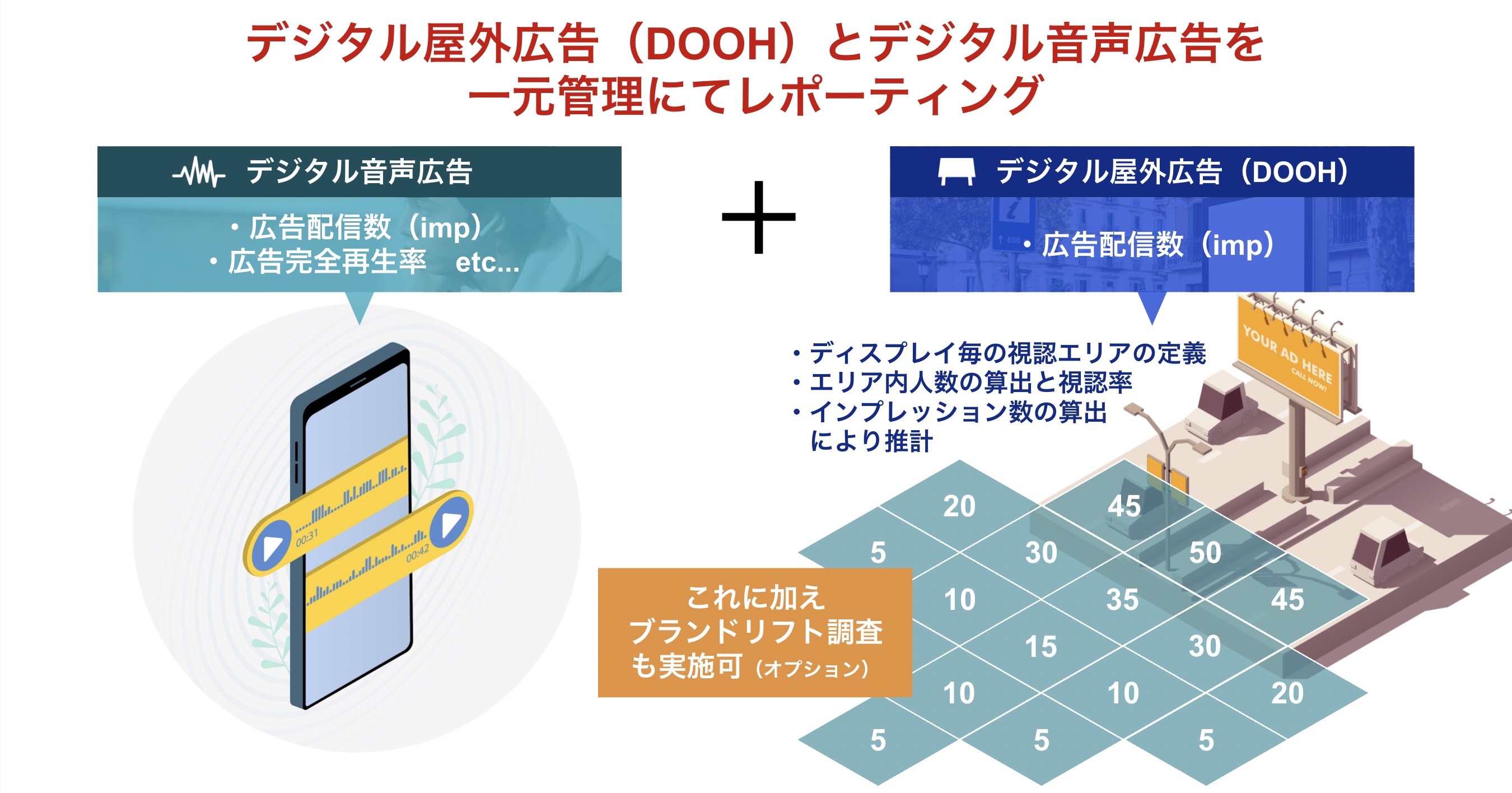 本プランでは、デジタル屋外広告(DOOH広告)の広告配信時のデータを、音声メディアに配信されるデジタル音声広告のデータと連携させることで、外出先の屋外広告と、耳元で流れる音声広告を連携させた広告配信を実現します。