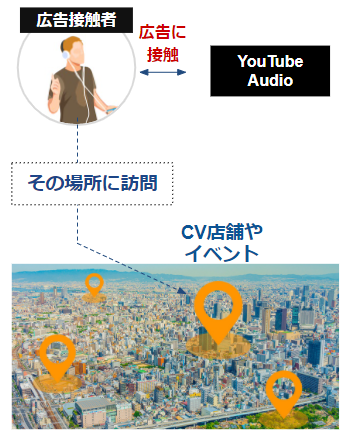 YouTube音声広告配信後に、ブランドリフト調査、リッスンスルーコンバージョン(間接CV)、来店コンバージョン(地点CV)など、商材にあわせた方法で効果検証が可能です。